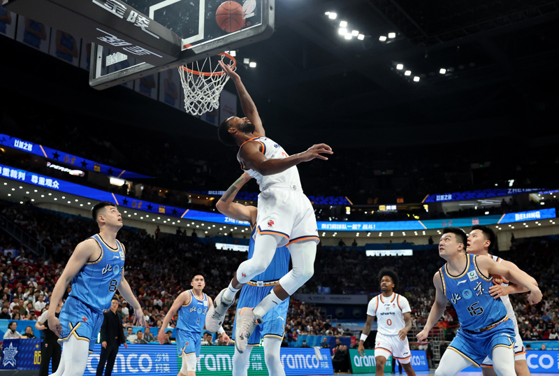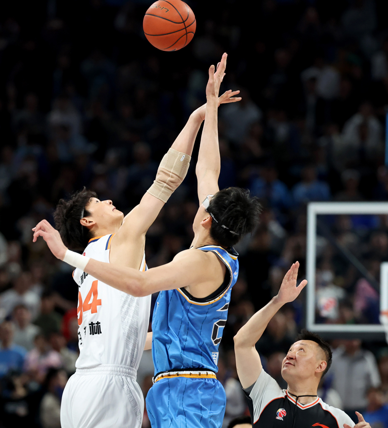 新华社相片,北京,2026年4月12日\n 4月12日,上海久事队球员王哲林(左)与北京北汽队球员周琦在比赛运行时跳球。\n 4月12日,在2025-2026赛季中国须眉篮球工作联赛(CBA)惯例赛第38轮比赛中,上海久事队客场88比83战胜北京北汽队。\n 新华社记者 张晨 摄