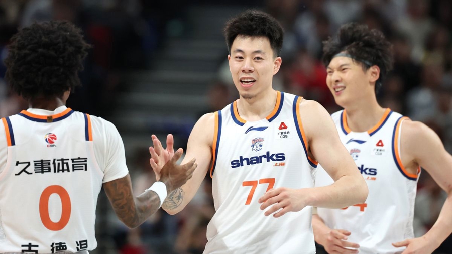 新华社相片,北京,2026年4月12日\n 4月12日,上海久事队球员张镇麟(中)在比赛中与队友古德温(左)庆祝得分。\n 4月12日,在2025-2026赛季中国须眉篮球工作联赛(CBA)惯例赛第38轮比赛中,上海久事队客场88比83战胜北京北汽队。\n 新华社记者 张晨 摄