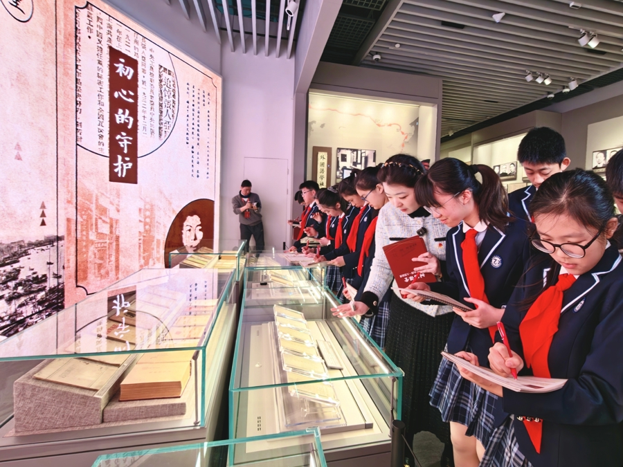 谈法课上,憨厚引导学生探寻中共一大挂牵馆“真义的滋味”展陈中72个版块的《共产党宣言》。