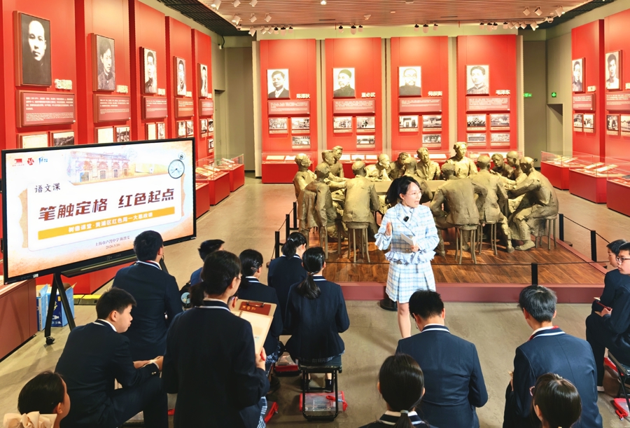 语文课在中共一大召开场景的雕饰群像前举行。