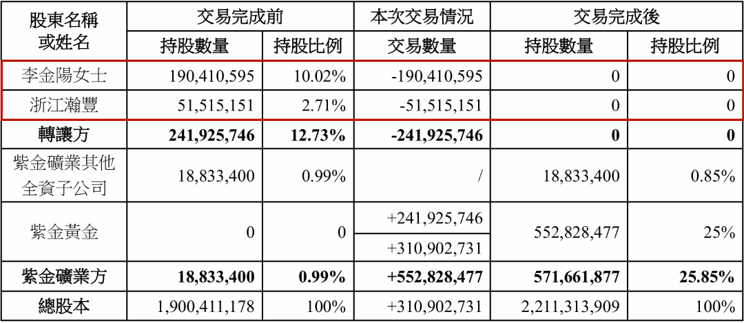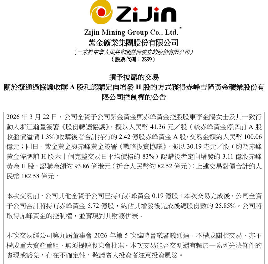 3月22日,紫金矿业(02899.HK,601899.SH)通过旗下全资子公司紫金黄金(集团)有限公司(简称“紫金黄金”),与赤峰黄金控股推进李金阳过火一致行径东说念主浙江瀚丰创业投资合股企业(有限合股) (简称“瀚丰创投”)签署股份转让合同,拟以41.36元/股的价钱收购后者共计握有的约2.42亿股赤峰黄金A股股份,走动金额约100.06亿元。
