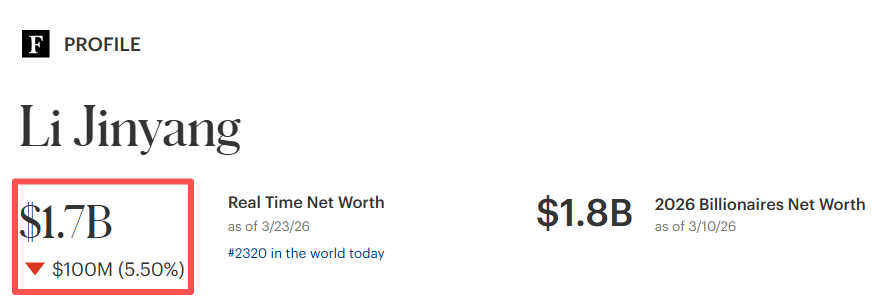 而福布斯及时富豪榜显露,李金阳当今领有17亿好意思元(约合东说念主民币117亿元)资产,在巨匠排第2320位。
