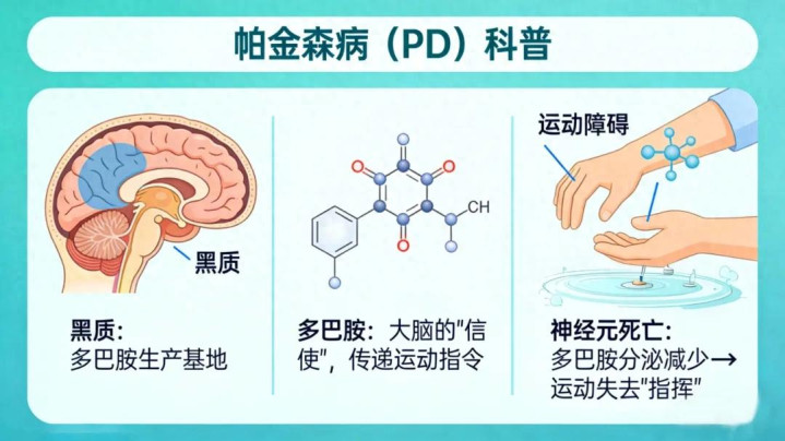 不祥来说,咱们的大脑里有一个叫作“黑质”的场地,它会产生一种叫作“多巴胺”的物资。当大脑黑质中的多巴胺能神经元大量死亡、多巴胺分泌减少到一定进度时,身体就会失去“指挥”,出现一系列引导落魄。
