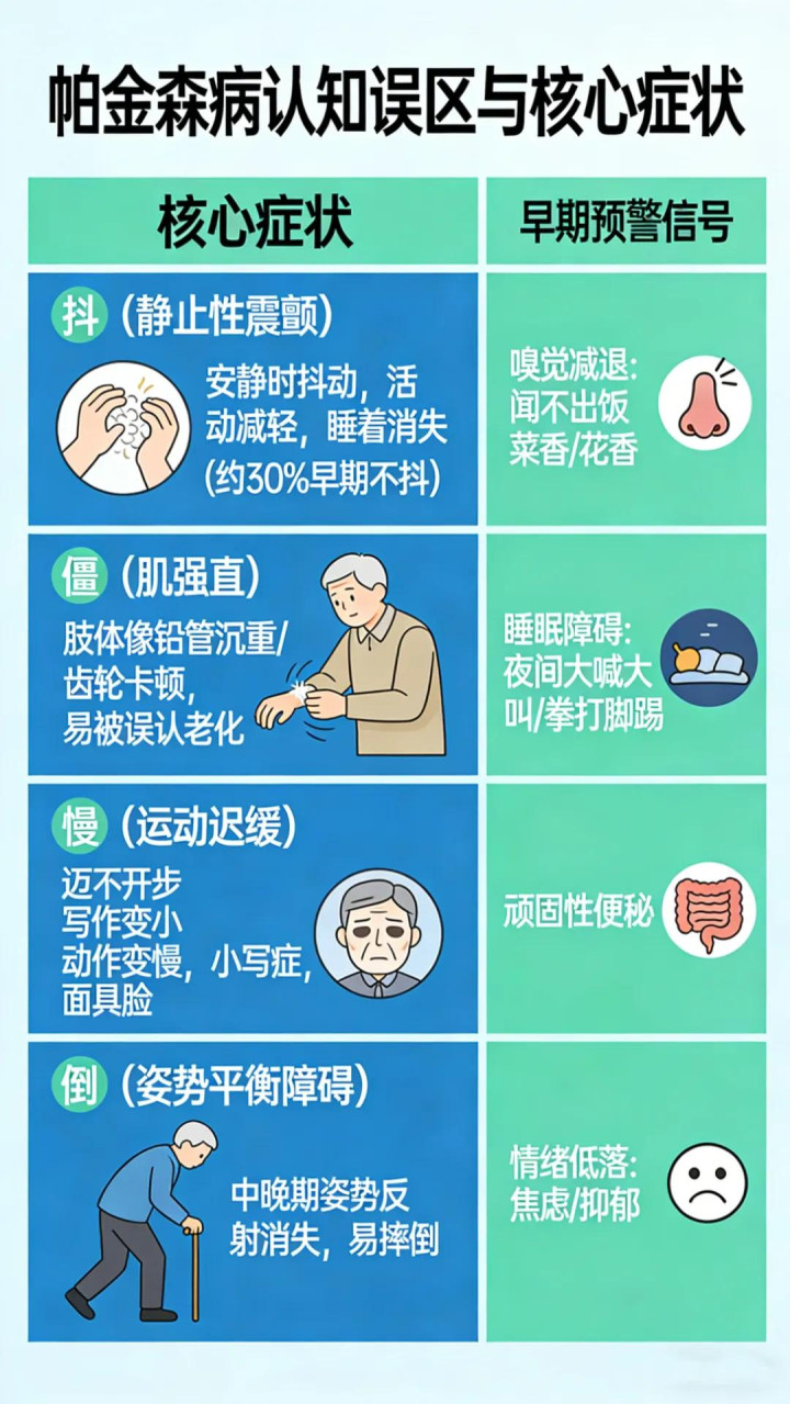 许多东说念主以为手抖等于帕金森,不抖就不是,这是最大的误区。帕金森病的中枢症状其实不错用四个字概述:抖、僵、慢、倒。