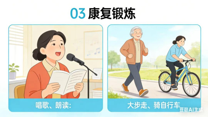 唱歌、朗诵:针对“面具脸”和吞咽贫瘠,考试口面部肌肉。