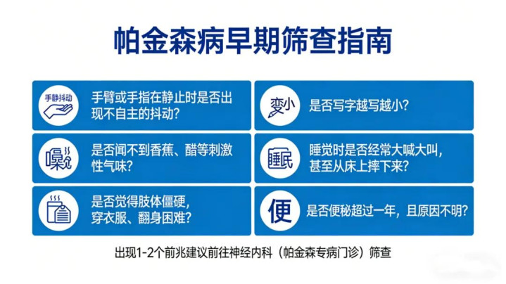 要是你或家东说念主出现以下前兆中的1-2个,残暴前去神经内科(帕金森专病门诊)筛查: