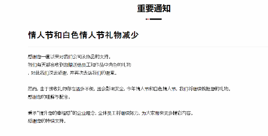 光荣特库摩于1月30日宣布,今年情人节以及白色情人节期间,将一律不接收“寄给员工或旗下游戏角色的任何礼物”。