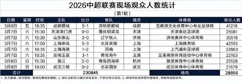 涌融资本2026中超首轮战罢,一个数字让所关系心中超的东谈主松了语气:场均28856东谈主。8场比赛,认为230845名球迷走进球场,莫得一场不雅众低于两万东谈主。这个近2.9万东谈主的场均数据,放在最近几年的联赛环境里,称得上是一个暖意完全的开局。