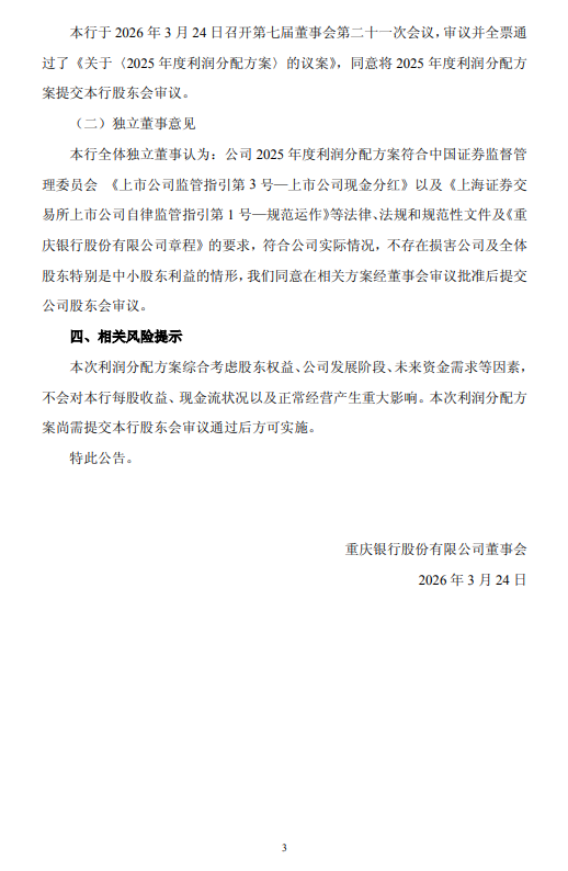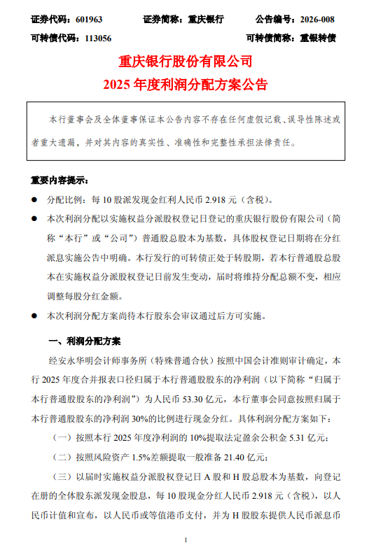 3月24日金融一线音书,重庆银行公布2025 年度利润分拨决策,拟每 10 股派发现款红利东谈主民币 2.918 元(含税)。