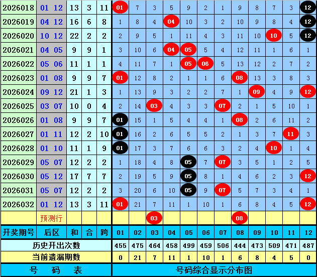 前区2路号码上期出现2个:26、32,走势温冷,最近50期2路号码出现90个,前10期2路号码开出17个,走势与表面特等,本期扫视2路号码渐渐温冷,预测开出1个,扫视号码:08。